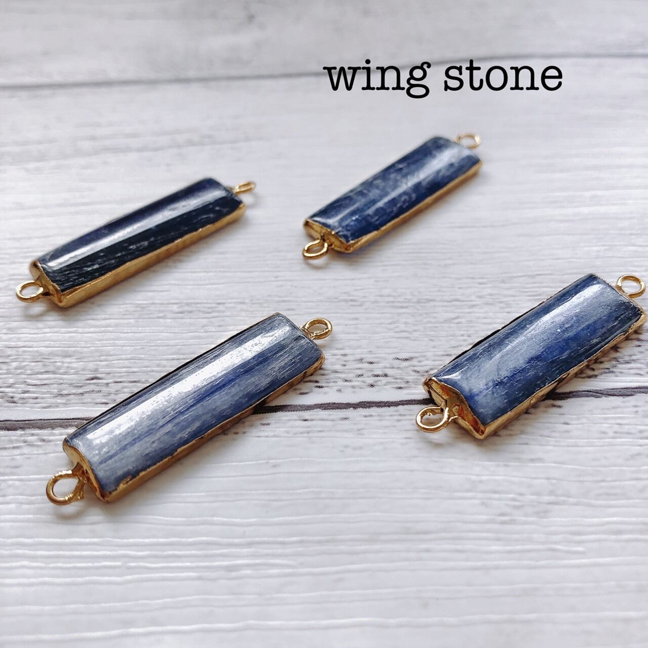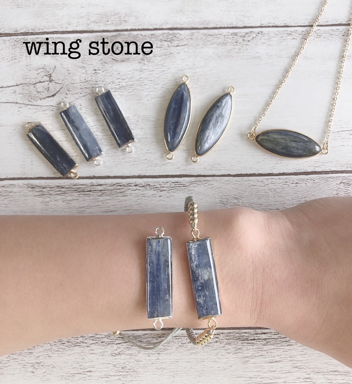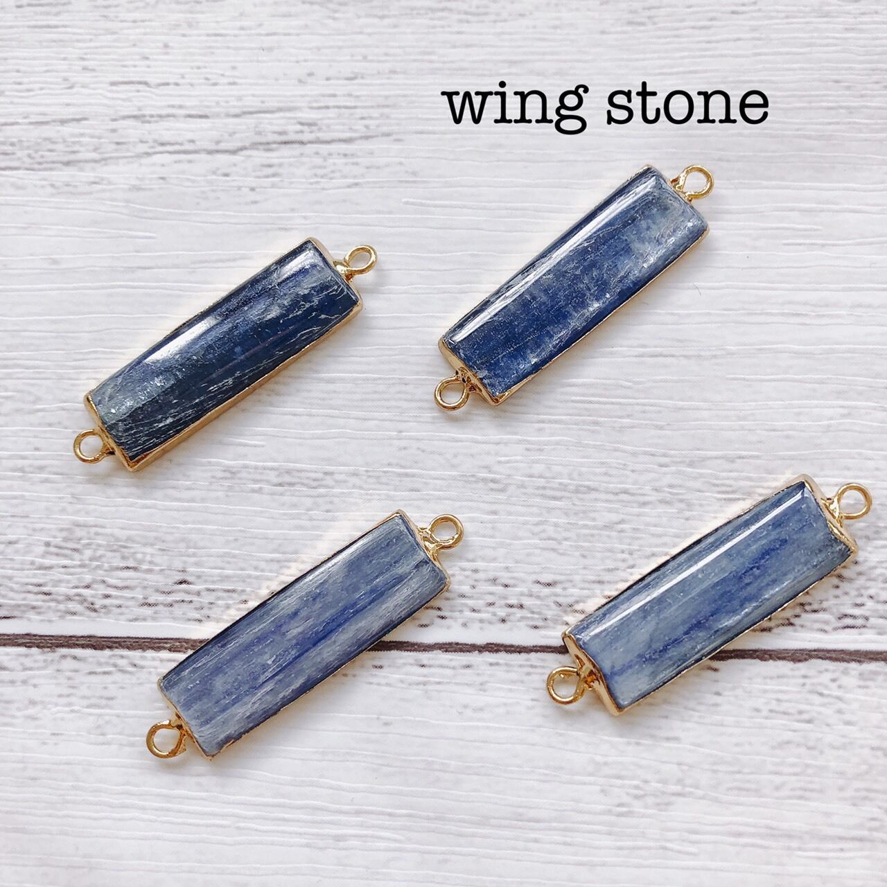カイヤナイトは、濃いブルー、青、水色、ホワイトの結晶がストライプ状(層のように)重なり合っていて、光や角度によって見えるグラデーションが美しいのが特徴です。キズのように見える箇所は薄い層になっている部分で天然石の特徴になります。