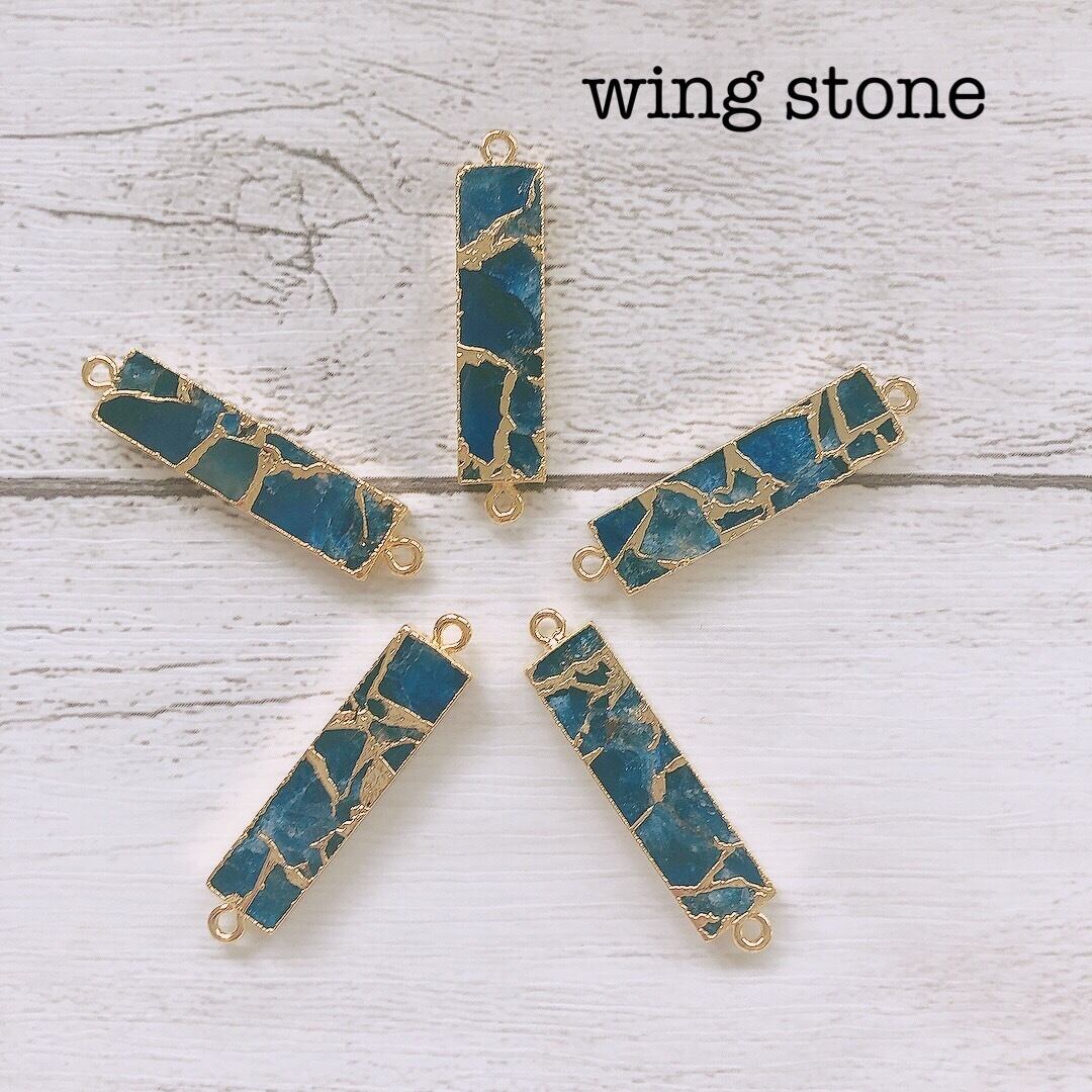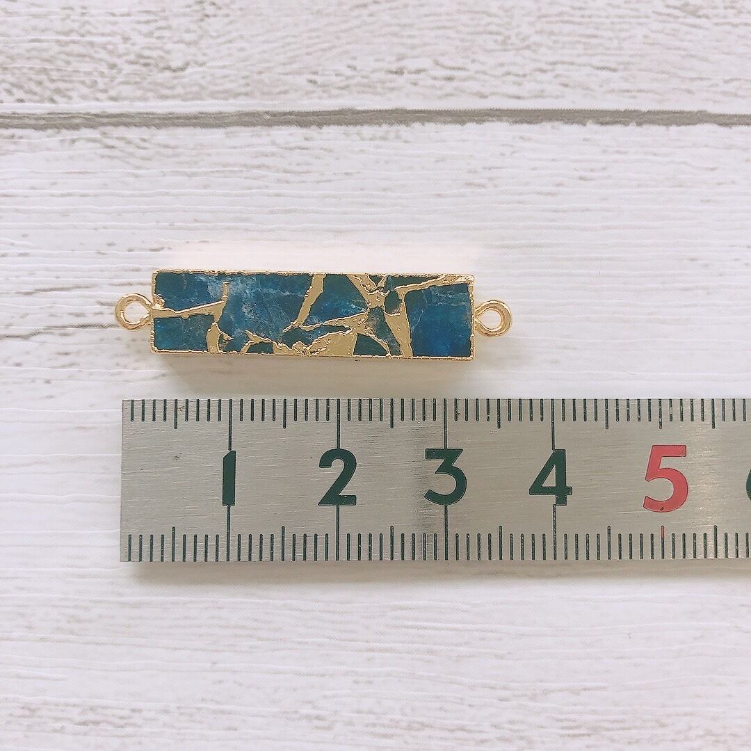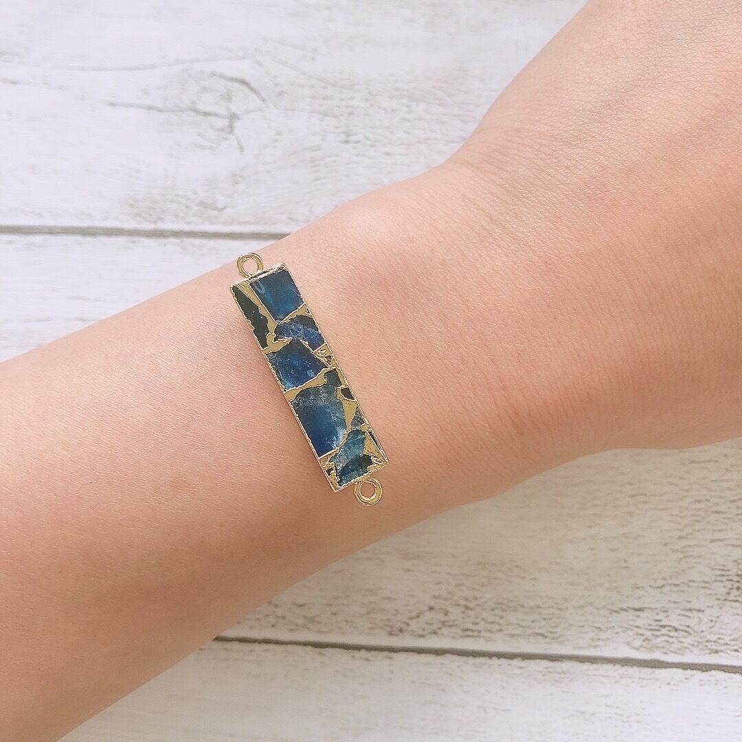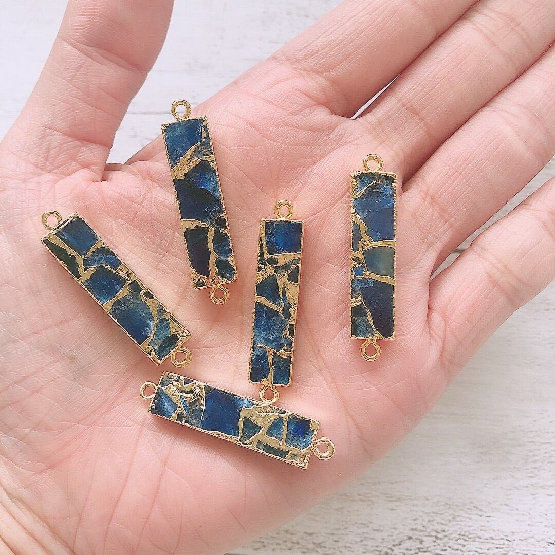 ジェイドサファイアを加工した天然石。透明感のあるブルーと上品なゴールドで仕上がった品のある個性的なパーツです。